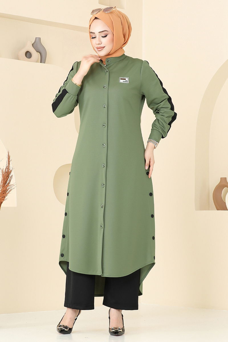 Product Feature : It is a new season hijab fashion product. The product has a Half Judge collar. The product has From the front buttons. Slach buttons are an accessory.. Unlined. The coat of arms detail is sewn. The waist of the trousers is elastic. There may be a tonal difference in the product due to concept photo shoots.