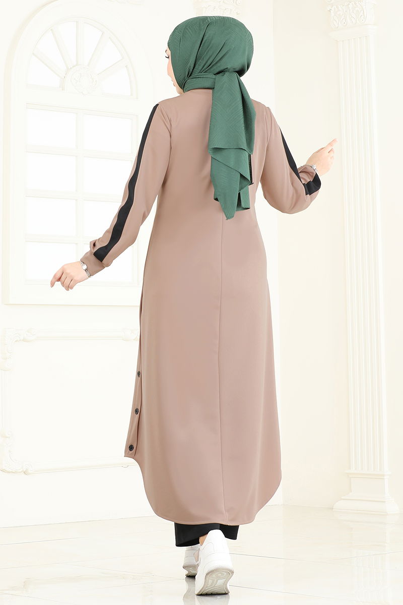 The Buttoned Slit Hijab Suit is a special design that can be comfortably used in all seasons. Crafted from knitted Dabıl fabric suitable for gentle wash at 30 degrees, this chic and modern suit highlights with its half mandarin collar and front button design, while the slit buttons provide an eye-catching accessory detail. Consisting of a tunic and trousers, this unlined set features an elastic waistband trousers. Offering both comfort and elegance, this design will become an indispensable part of your wardrobe.