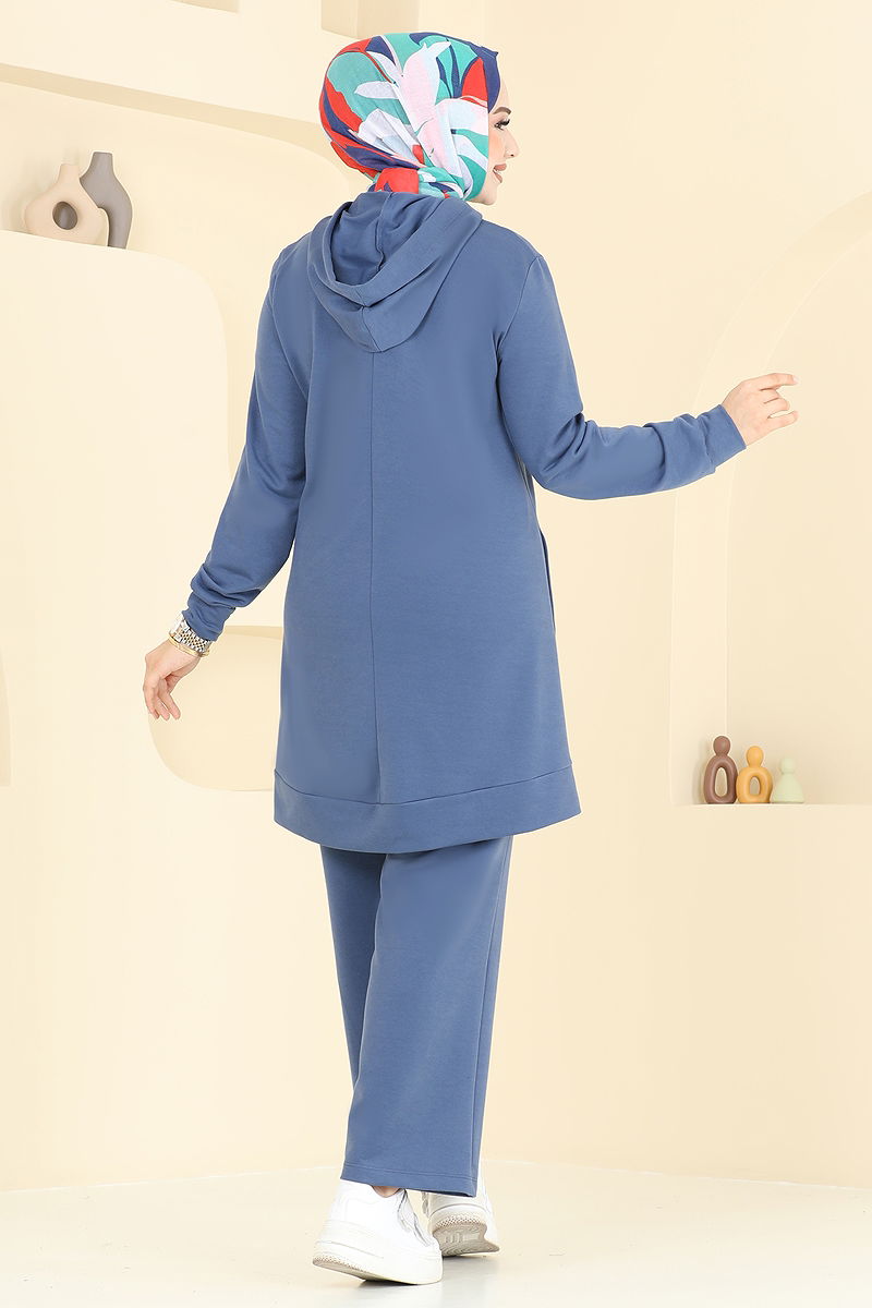 The Snap Detail Hijab Suit, with its model, offers comfort in all seasons. Made from double-thread fabric, this stylish suit can be washed at 30 degrees on a delicate cycle. The product features a hooded neckline and is unlined. The tunic and elastic-waisted pants provide ease of use. The product on the model is size 38.