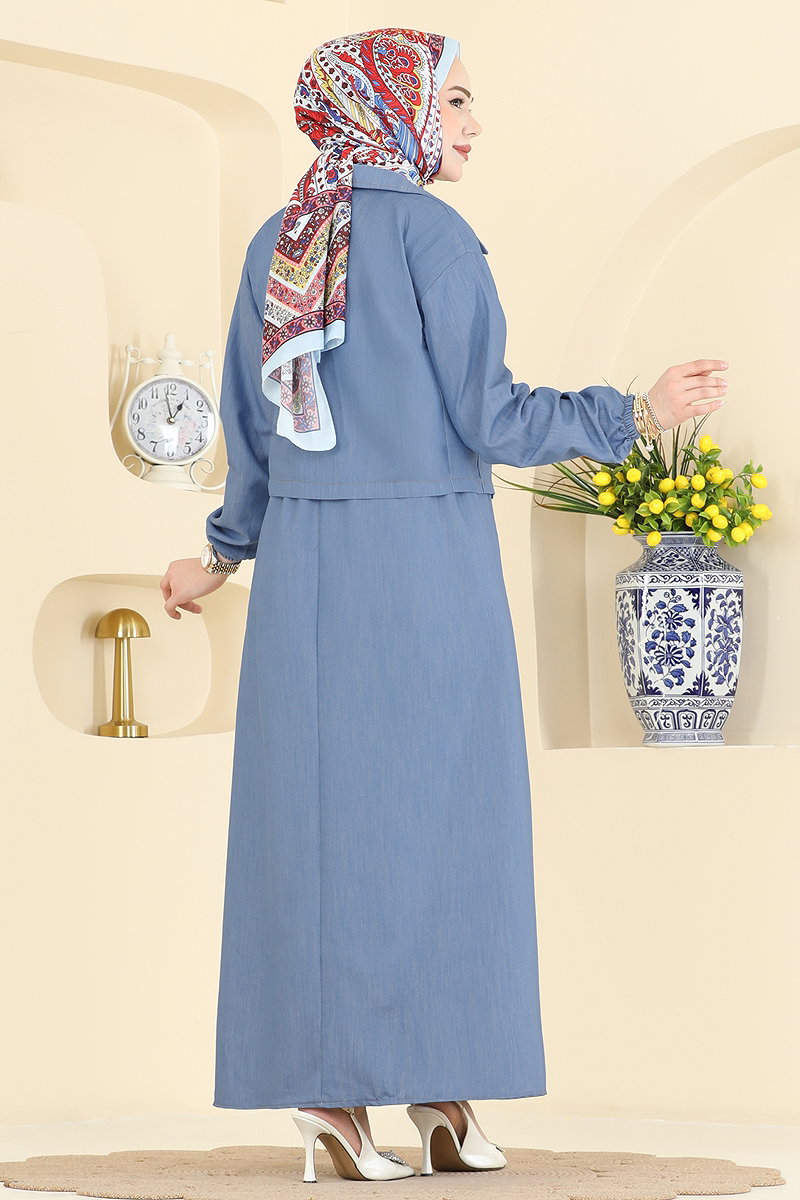 The Denim Skirt Suit Combination is suitable for hijab style and can be comfortably worn in all seasons. This set, which can be washed gently at 30 degrees, is made of denim fabric. It features a shirt collar and is unlined. The suit includes a front zipper and the zipper detail is functional. Accessory details are meticulously sewn onto the product. The jacket and skirt have an elastic waist, making it perfect for daily wear. The cuffs are elastic and both the skirt and jacket feature decorative pocket details.
