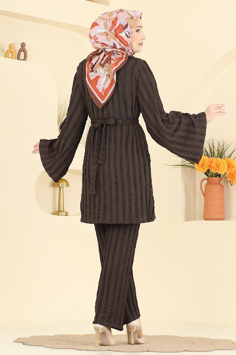 The Belted Accessory 2-Piece Hijab Set is perfect for all seasons. Distinct with specially designed brooch and belt details, this set is made from Amozon knit fabric and can be washed gently at 30 degrees. With its bike-collar and unlined design, it provides a comfortable yet elegant appearance. The set features a sash and elastic waistband on the trousers, enhancing your comfort without compromising style. The belt is optionally removable, allowing you to create various looks with the brooch.