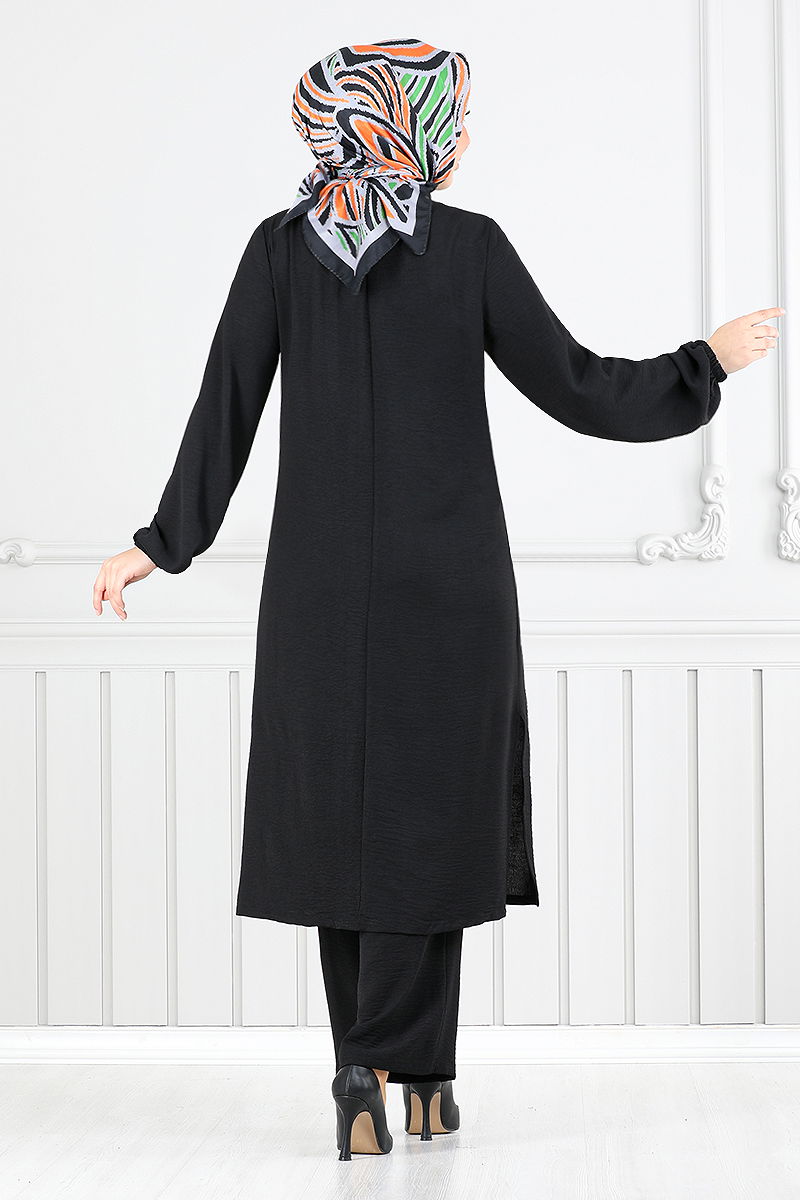 The Side-Slit Aerobin Suit is a chic and comfortable option, ideal for those who prefer modest clothing. Made from aerobin fabric, this set is light and breathable, providing comfort throughout the day. It is suitable for gentle wash at 30 degrees, offering ease of care. The suit features a bicycle neck tunic and pants with an elastic waist for practical use. The tunic has an elegant button detail accessible from the back. With elastic cuffs, this set combines elegance with comfort efficiently.