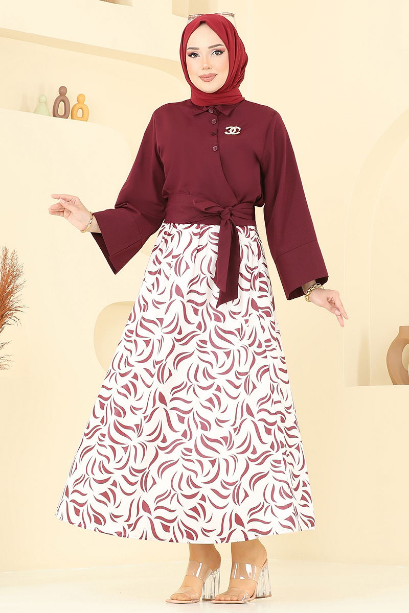 Product Feature : It is a new season hijab fashion product. It has a belt that can be fastened from the side. The product has a Shirt collar. The product has From the front buttons. Unlined. Belt is sewn to the product. Accessories are not included. The skirt waist is elastic. There may be a tonal difference in the product due to concept photo shoots.