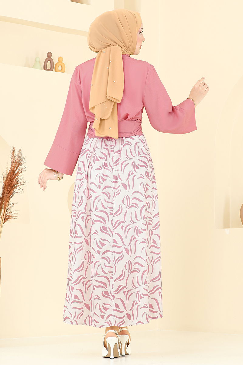 Product Feature : It is a new season hijab fashion product. It has a belt that can be fastened from the side. The product has a Shirt collar. The product has From the front buttons. Unlined. Belt is sewn to the product. Accessories are not included. The skirt waist is elastic. There may be a tonal difference in the product due to concept photo shoots.