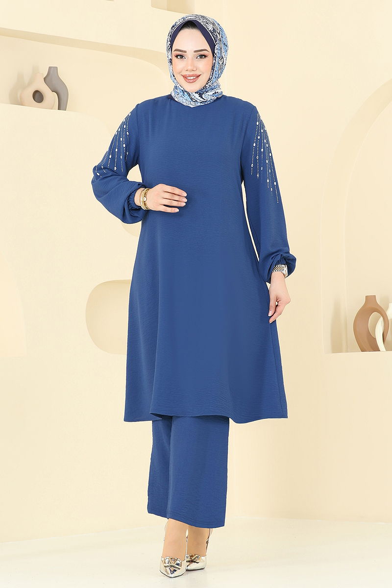 Shine in the Stone Detail Set This hijab set brings together elegance with its expanded bicycle neck and glued stone details, offering comfort and elegance throughout all four seasons. Easily washable at 30 degrees with delicate care, this aerobin fabric suit is not only ideal for everyday use but also for your special occasions. The tunic and pants feature elastic cuffs and a buttoned design on the back, prioritizing comfort while maintaining lightness with its lining-free structure. The size 38 on the model can be perfectly adapted to every size with its elastic belt at the waist.