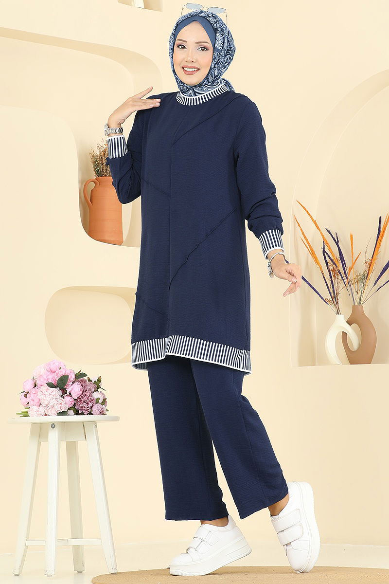 Garni Detail Suit is a modest fashion product suitable for all seasons. Made from special Aerobin fabric, it is light and breathable. It offers easy care with gentle wash at 30 degrees. The suit features a crew neck design and is unlined. The dress is a pullover, and the pants have an elastic waist. Ideal for both stylish and comfortable wear. (Displayed product is size 38.)