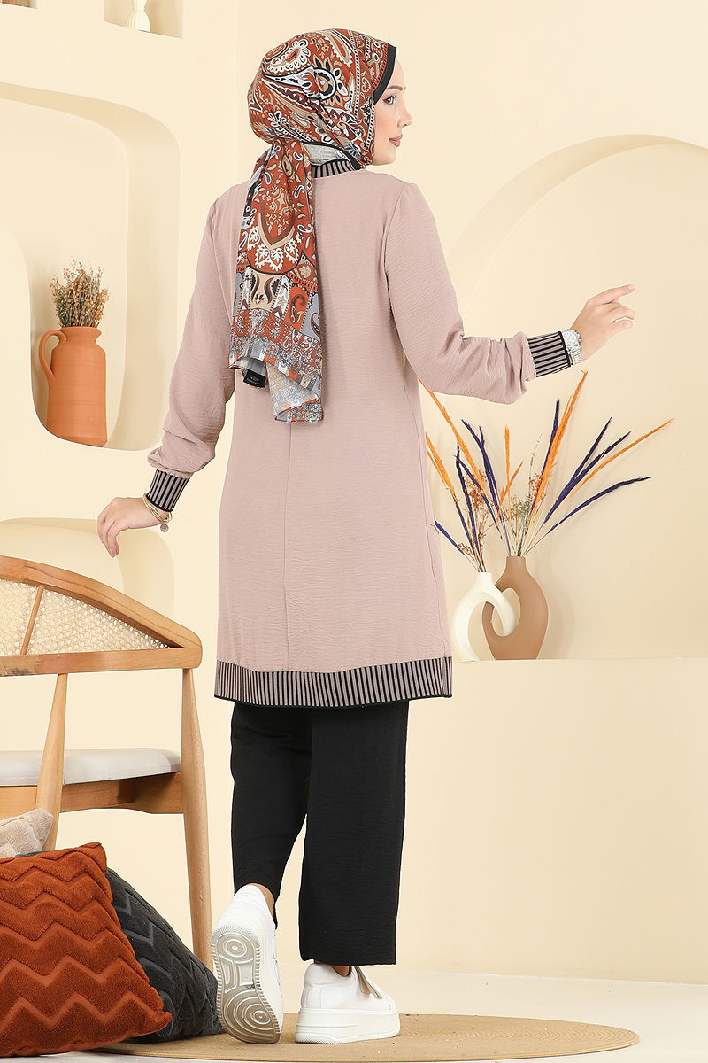 Garni Detail Suit is a modest fashion product suitable for all seasons. Made from special Aerobin fabric, it is light and breathable. It offers easy care with gentle wash at 30 degrees. The suit features a crew neck design and is unlined. The dress is a pullover, and the pants have an elastic waist. Ideal for both stylish and comfortable wear. (Displayed product is size 38.)