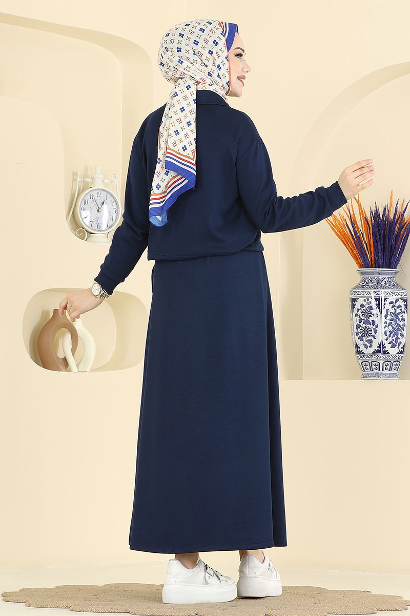 The Tuniği Lace-up Modal Set is a versatile hijab outfit suitable for wearing across all seasons. It can be washed gently at 30 degrees without wringing. Featuring a shirt collar design and unlined, the product in the image is size 38. It has a half-zipper at the front for easy wear and adjustable drawstrings at the right and left hem. The skirt has an elastic waist for comfort.