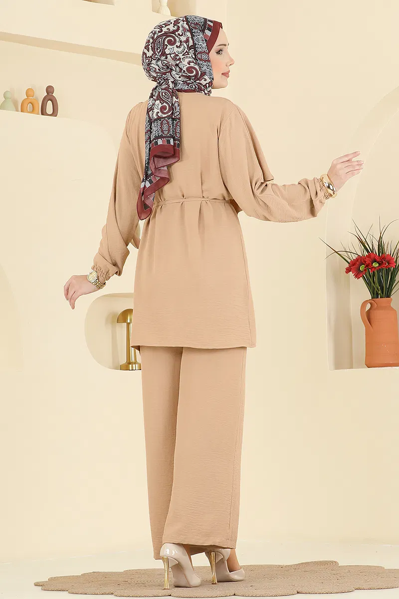 The Buckle Accessory Aerobin Set is a hijab outfit that can be comfortably used in all seasons. This special design, which can be washed at 30 degrees on a gentle cycle, is made of aerobin fabric and features a bicycle neckline. This unlined model combines elegance with back button and buckle details. The team, which offers different usage possibilities with its drawstring detail, prioritizes comfort with its elastic-cuffed pants. The product model worn is size 38.