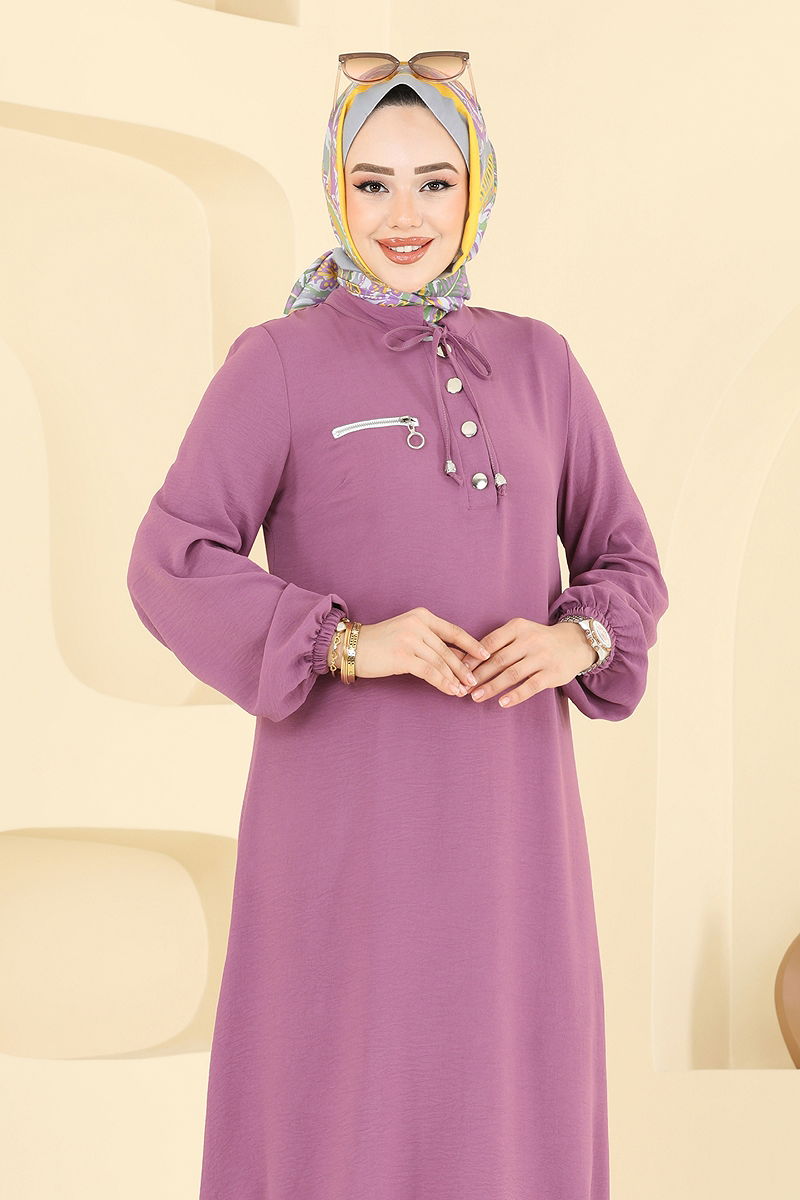 Button Detailed Hijab Outfit; this stylish design, suitable for all seasons, is made from aerobin fabric. It can be washed at 30 degrees with delicate wash. It offers a modern look with a semi-mandarin collar and half-buttoned front design. Elastic details are included at the hem of the tunic and the cuffs of the pants, while the tie and zipper details are merely added as accessories. This outfit combines comfort and elegance.