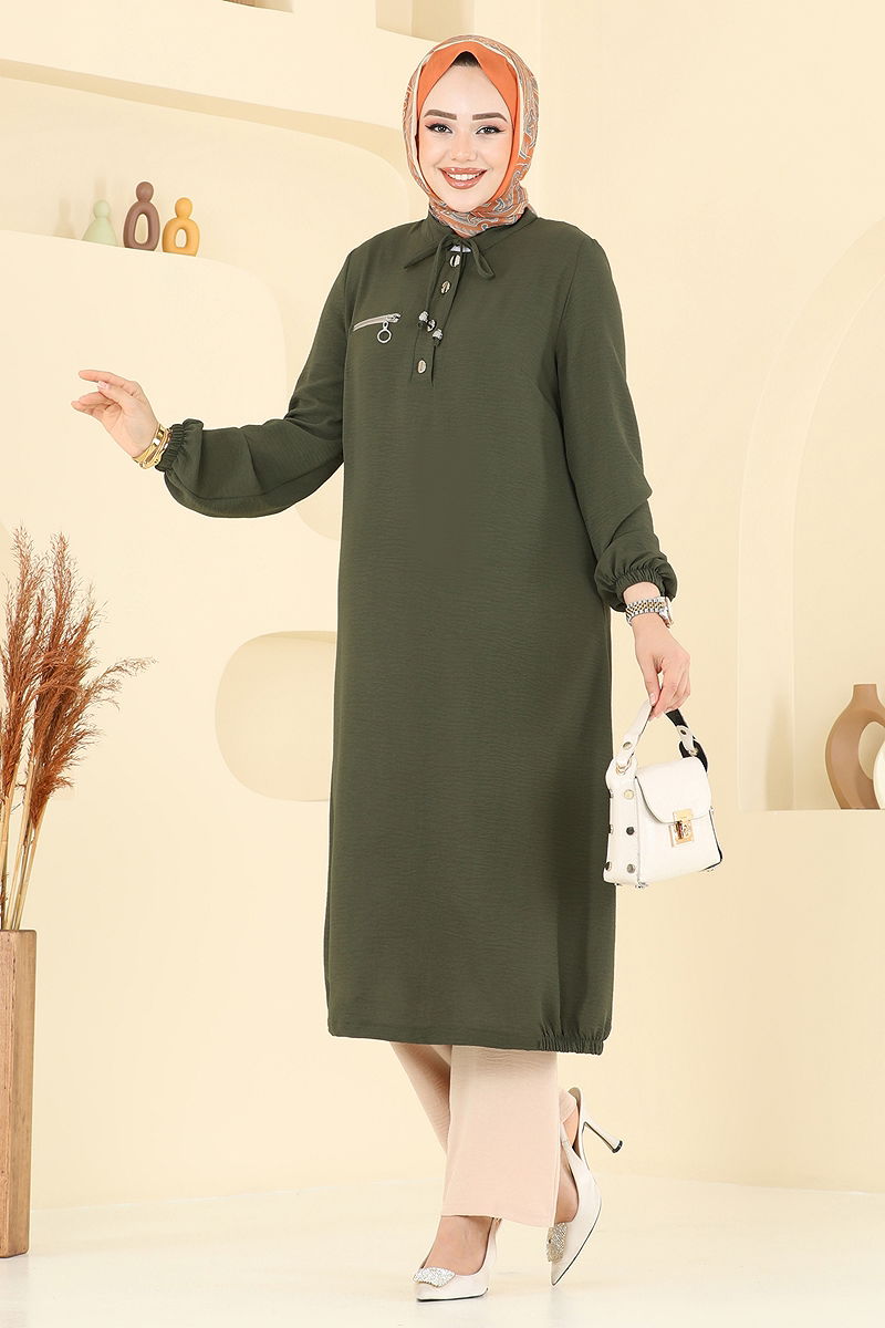 Button Detailed Hijab Outfit; this stylish design, suitable for all seasons, is made from aerobin fabric. It can be washed at 30 degrees with delicate wash. It offers a modern look with a semi-mandarin collar and half-buttoned front design. Elastic details are included at the hem of the tunic and the cuffs of the pants, while the tie and zipper details are merely added as accessories. This outfit combines comfort and elegance.