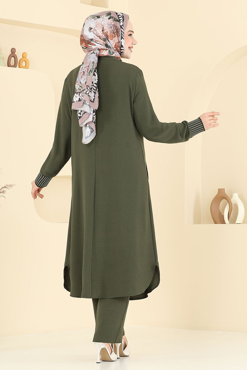 المنتج لديه ياقة نصف بيضوية. غير مبطنة. المنتج به سحاب في جزء من الأمام. البلوزة غير متضمنة. صُنعت عينة من المجموعة مع البلوزة لإظهار الاستخدام المقصود للمنتج. الجيب متاح. خصر البنطال مرن. قد يكون هناك اختلاف في الدرجة اللونية في المنتج بسبب التقاط الصور الفوتوغرافية.