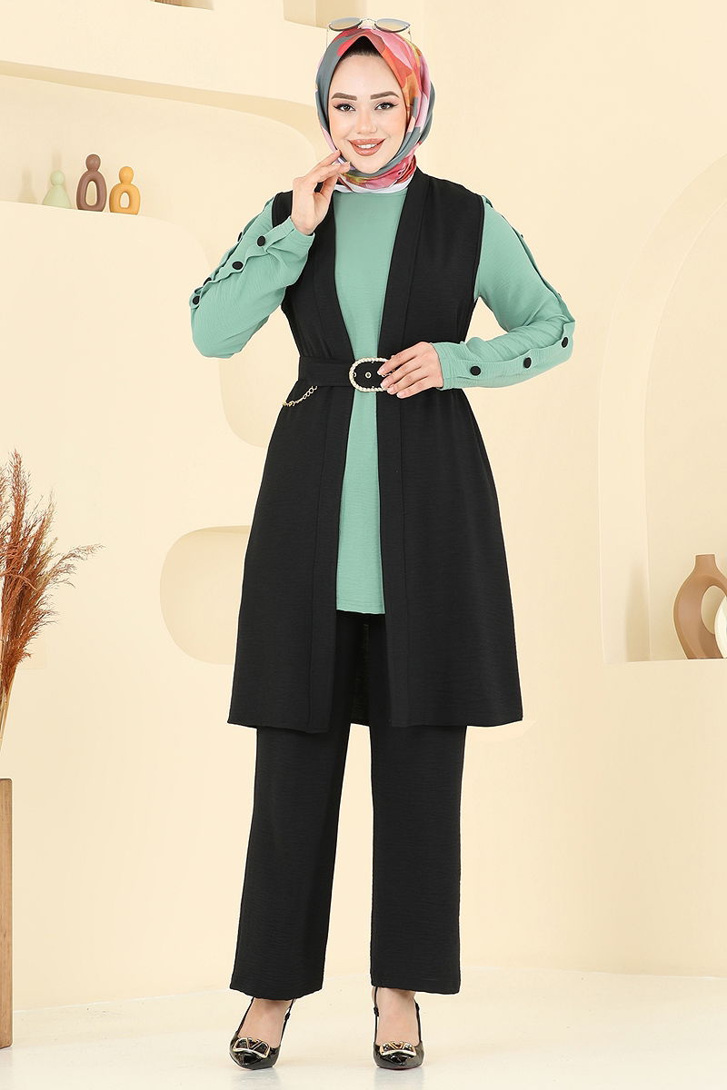 The Triplet Vest Hijab Set offers an elegant and practical design that can be comfortably used in all seasons. Made of aerobin fabric, it is lightweight and comfortable and can be washed at 30 degrees on a gentle cycle. The crew neck and unlined design provide a modern look. The product is completed with built-in chain details and a belt, with an overhead dress design. The pants have an elastic waist for maximum comfort. Whether for everyday wear or special occasions, the Triplet Vest Hijab Set offers elegance and comfort.