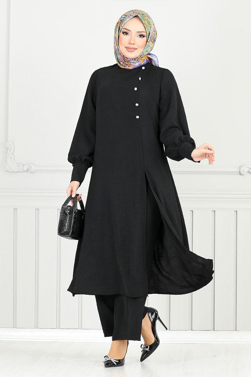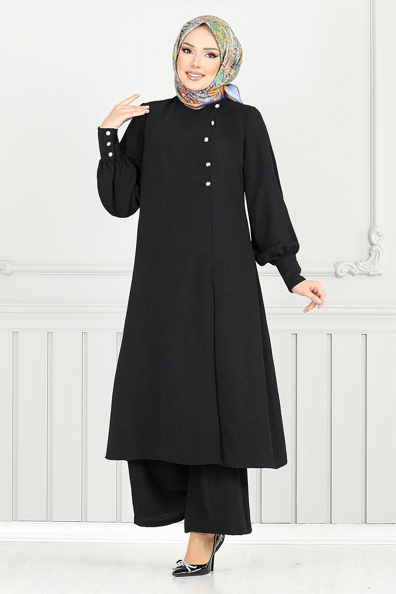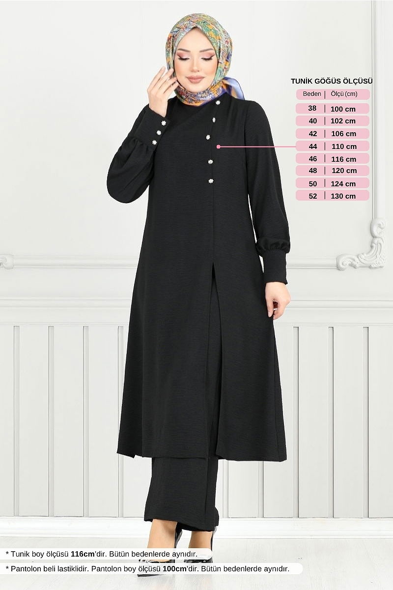 The Accessory Buttoned Hijab Suit is a combination model made from aerobin fabric and can be comfortably worn in all seasons. It can be washed gently at 30 degrees. With its bicycle collar, slit details, and unlined design, it is modern and stylish. It has a zipper at the back, an elastic waistband on the pants, and active cuff buttons. The buttons are for accessory purposes only.