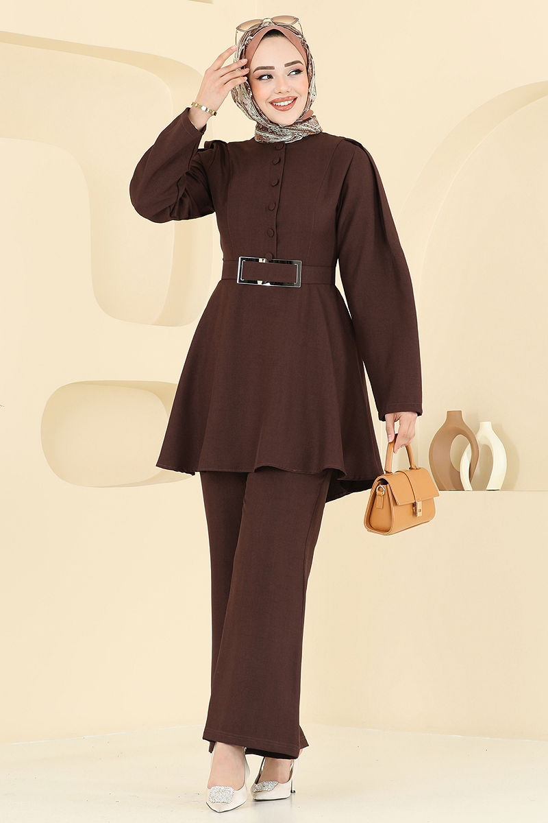 The Half-Buttoned Linen Suit is a chic option for veiled women to comfortably wear across all seasons. Made from Sofia linen, this suit features a bicycle neck design, half-buttoned front opening, and is unlined. The pants have an elastic waist for easy wear, and the included belt can be optionally used. The ends of the belt are sewn to prevent waviness.