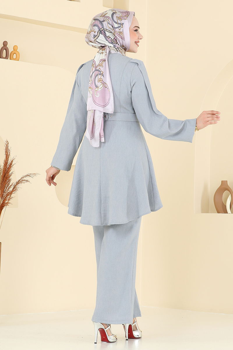 The Half-Buttoned Linen Suit is a chic option for veiled women to comfortably wear across all seasons. Made from Sofia linen, this suit features a bicycle neck design, half-buttoned front opening, and is unlined. The pants have an elastic waist for easy wear, and the included belt can be optionally used. The ends of the belt are sewn to prevent waviness.