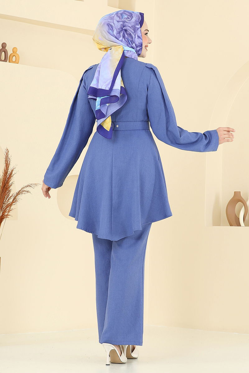 The Half-Buttoned Linen Suit is a chic option for veiled women to comfortably wear across all seasons. Made from Sofia linen, this suit features a bicycle neck design, half-buttoned front opening, and is unlined. The pants have an elastic waist for easy wear, and the included belt can be optionally used. The ends of the belt are sewn to prevent waviness.