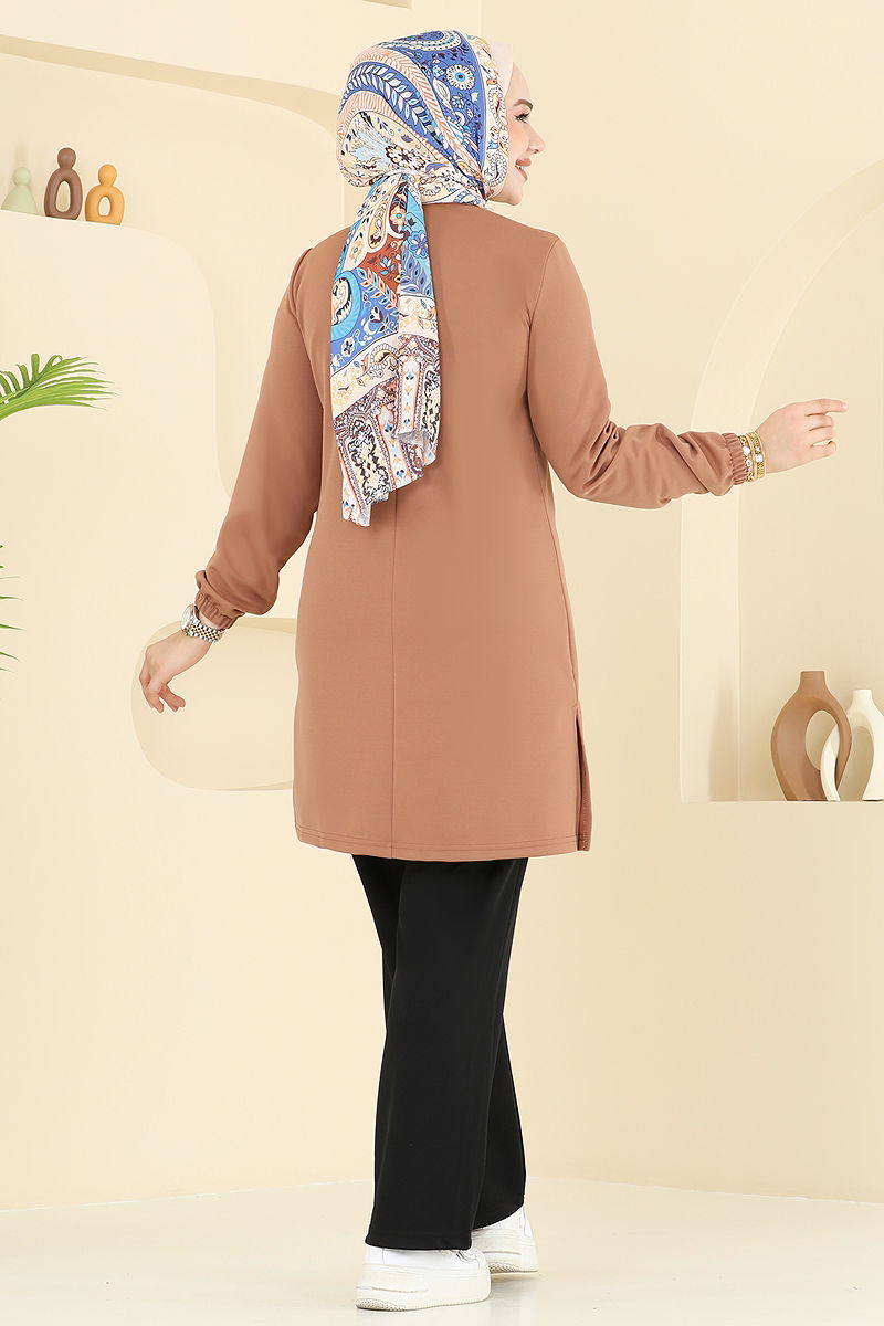 Elasticated Cuffs Hijab Suit combines both comfort and style, suitable for all seasons. This product is made from carefully chosen knit double fabric and can be washed at 30 degrees on a gentle cycle. The bicycle neck tunic design with side slits offers freedom of movement, while the elastic waist pants are designed with elasticated cuffs. This combination model provides elegance and practicality, ensuring you maintain your style throughout the day. It is worn overhead and is unlined, with the model wearing size 38.