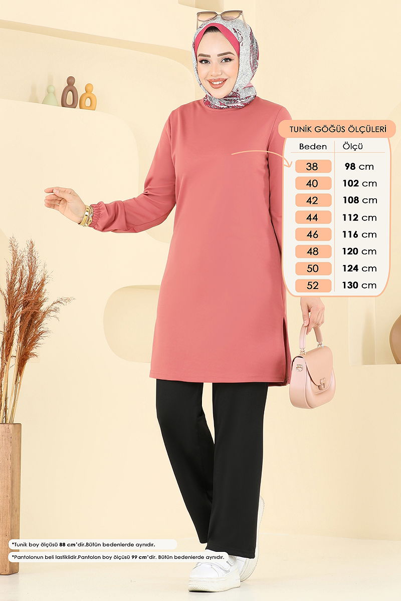 Elasticated Cuffs Hijab Suit combines both comfort and style, suitable for all seasons. This product is made from carefully chosen knit double fabric and can be washed at 30 degrees on a gentle cycle. The bicycle neck tunic design with side slits offers freedom of movement, while the elastic waist pants are designed with elasticated cuffs. This combination model provides elegance and practicality, ensuring you maintain your style throughout the day. It is worn overhead and is unlined, with the model wearing size 38.