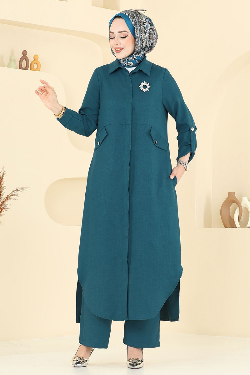 The accessory-pocketed linen suit is a specially designed modest wear that can be worn in all seasons. Offering comfortable wear with its soft texture, this suit can be washed at 30 degrees on a delicate cycle. Made from Sofia linen fabric, this model features a hidden buttoned shirt collar and a tunic with side slits. The tunic is unlined, and the pants have an elastic waistband for comfort. Buttons are added as decorative accessories, and the cuff buttons are actively usable.