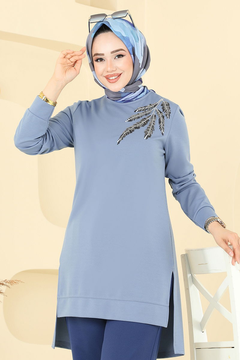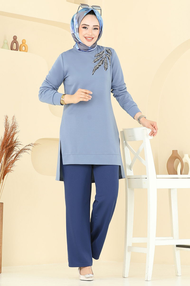 يتم ارتداء المنتج على الرأس. المنتج لديه ياقة دائرية. البلوز تحتوي على فتحة. غير مبطنة. تُخاط تفاصيل اللؤلؤ. تفاصيل الخرز معبئة خصر البنطال مرن. قد يكون هناك اختلاف في الدرجة اللونية في المنتج بسبب التقاط الصور الفوتوغرافية.