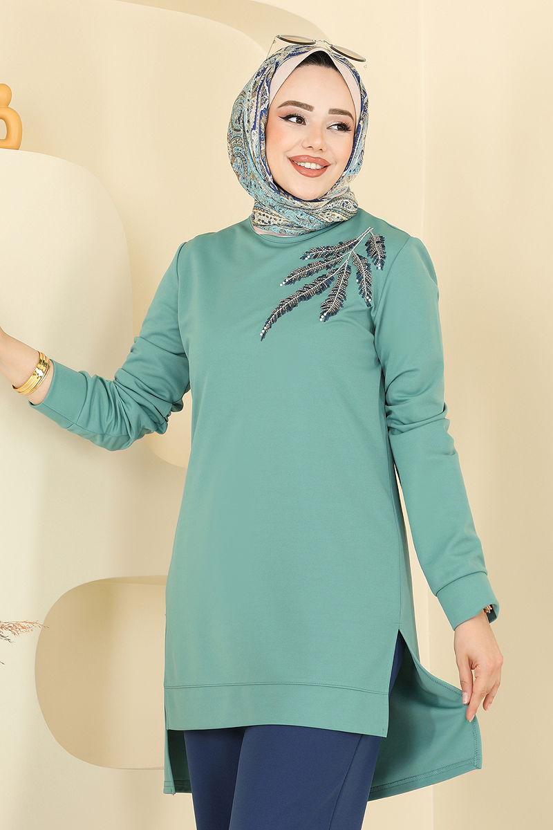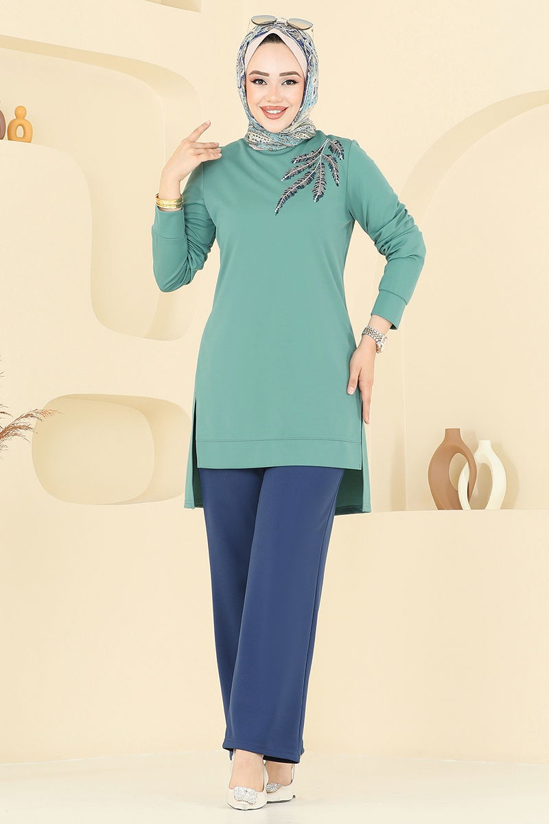يتم ارتداء المنتج على الرأس. المنتج لديه ياقة دائرية. البلوز تحتوي على فتحة. غير مبطنة. تُخاط تفاصيل اللؤلؤ. تفاصيل الخرز معبئة خصر البنطال مرن. قد يكون هناك اختلاف في الدرجة اللونية في المنتج بسبب التقاط الصور الفوتوغرافية.