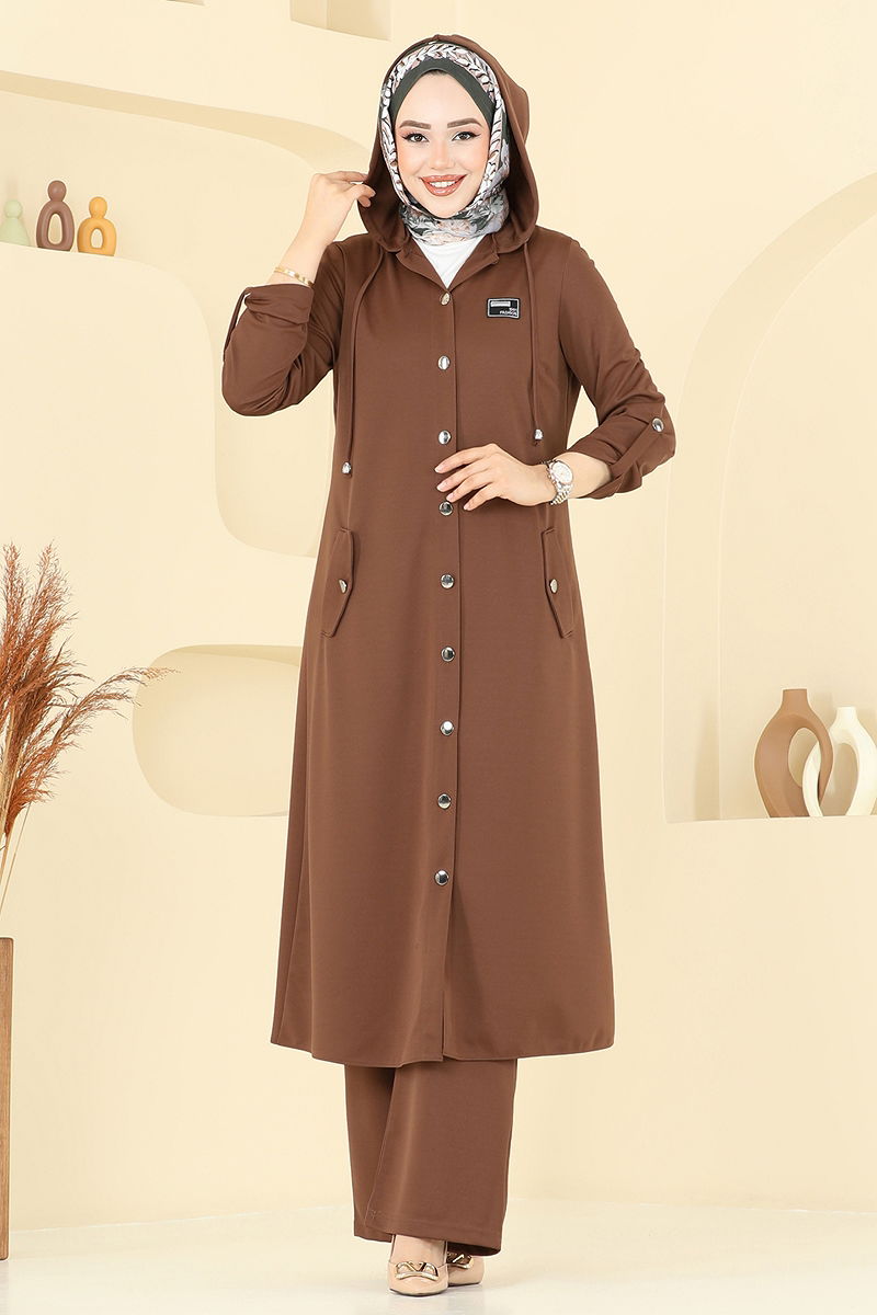 Product Feature : It is a new season hijab fashion product. The product has a Hooded collar. The product has From the front buttons. Unlined. The coat of arms detail is sewn. The hood is sewn to the product. Lacing details are accessories. Blouse is not included. Sample combination is made with the blouse to show the intended use of the product. Pocket available. The waist of the trousers is elastic. Cuff buttons are active. There may be a tonal difference in the product due to concept photo shoots.