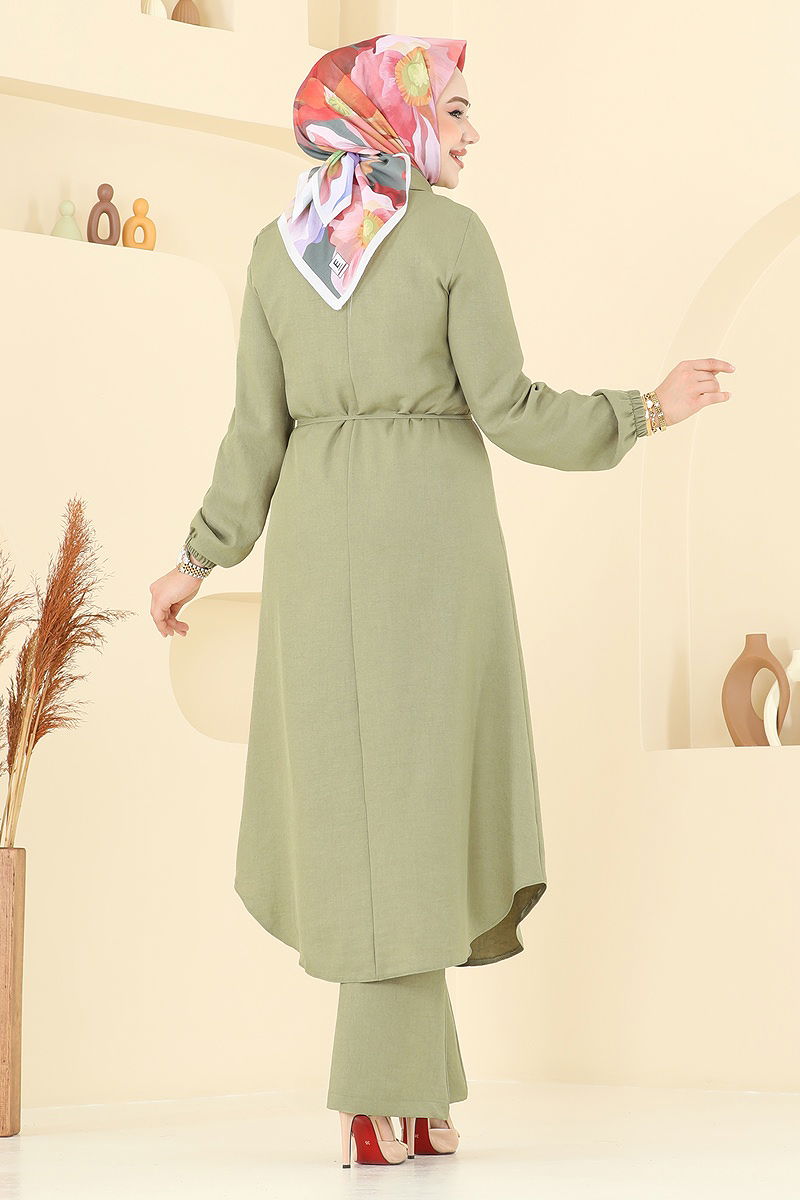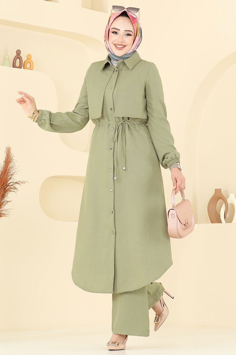 Product Feature : It is a new season hijab fashion product. The product has a Shirt collar. The product has From the front buttons. Unlined. Details are sewn. Belt included, optional not available. Blouse is not included. Sample combination is made with the blouse to show the intended use of the product. The waist of the trousers is elastic. The cuff is rubberized. There may be a tonal difference in the product due to concept photo shoots.