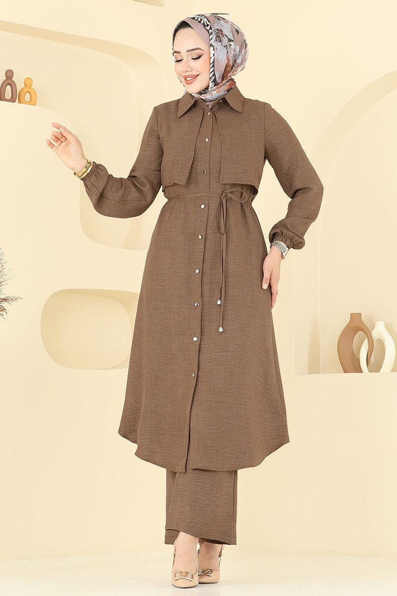 Product Feature : It is a new season hijab fashion product. The product has a Shirt collar. The product has From the front buttons. Unlined. Details are sewn. Belt included, optional not available. Blouse is not included. Sample combination is made with the blouse to show the intended use of the product. The waist of the trousers is elastic. The cuff is rubberized. There may be a tonal difference in the product due to concept photo shoots.