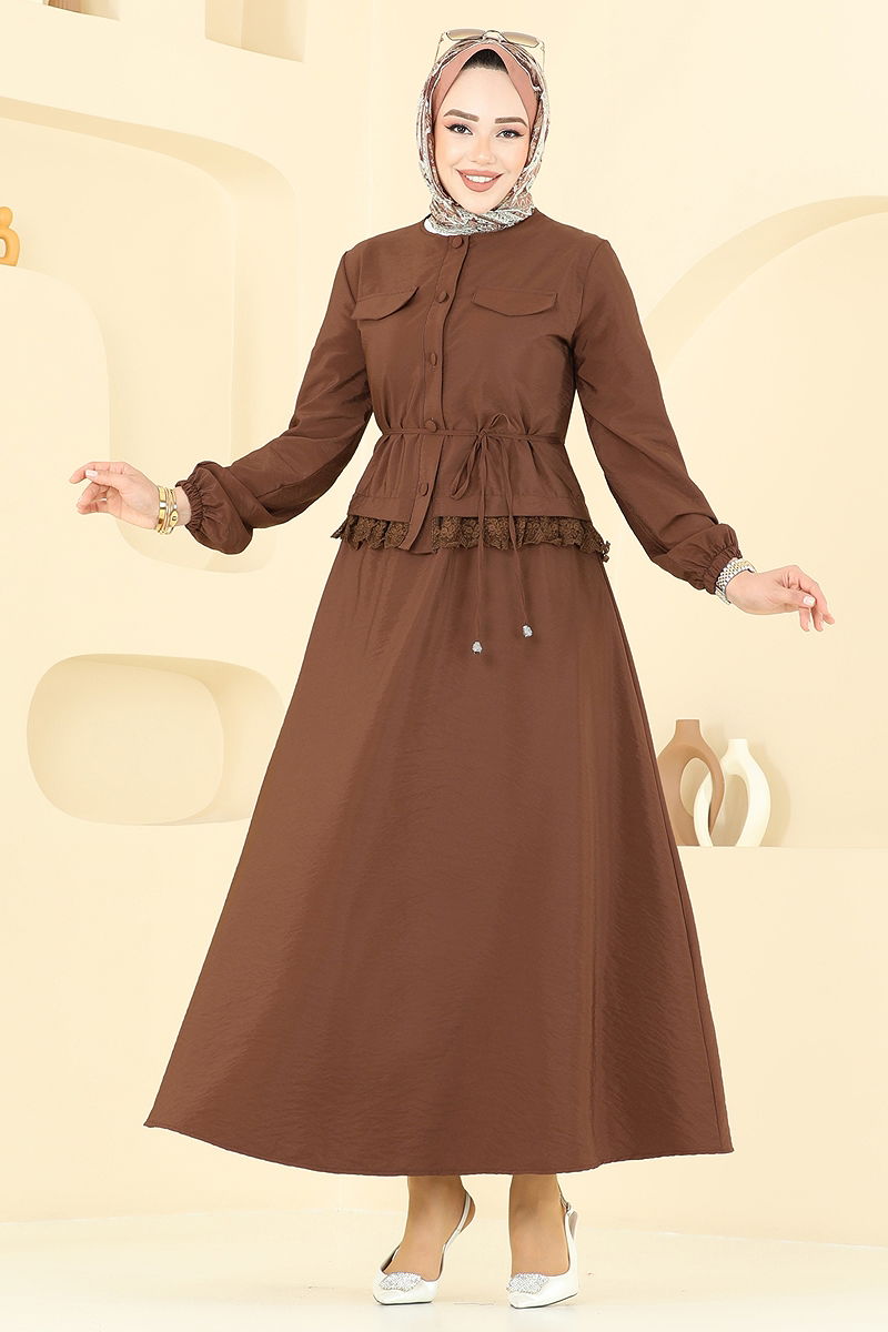 Product Feature : It is a new season hijab fashion product. The product has a Cycling collar. The product has From the front buttons. Unlined. The guipure detail is sewn. Belt included, optional not available. Blouse is not included. Sample combination is made with the blouse to show the intended use of the product. Pocket detail is an accessory. The skirt waist is elastic. The cuff is rubberized. There may be a tonal difference in the product due to concept photo shoots.