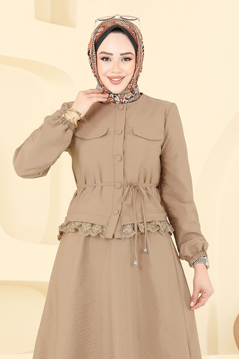 المنتج لديه ياقة دائرية. المنتج به أزرار من الأمام. غير مبطنة. التفاصيل المخرمة مخيطة. الحزام متضمن، ،يمكن استخدامها حسب الرغبة البلوزة غير متضمنة. صُنعت عينة من المجموعة مع البلوزة لإظهار الاستخدام المقصود للمنتج. تفاصيل الجيب من الملحقات. .خصر التنورة مرن السوار مطاطي. قد يكون هناك اختلاف في الدرجة اللونية في المنتج بسبب التقاط الصور الفوتوغرافية.