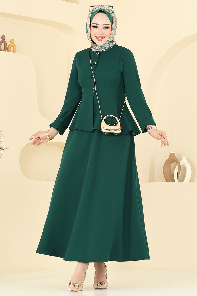 This suit, which can be comfortably worn across all seasons, is washable at 30 degrees with its delicate structure. Made from woven Dabıl fabric, this product stands out with its crew neck and front button design. The unlined structure provides a light and comfortable wear. The size displayed on the model is medium, with measurements: height 165 cm, chest 88 cm, waist 68 cm, hips 99 cm. The waistline of the product is stitched, and it does not include a belt or blouse; however, the blouse combined sample highlights the intended use of the product. The skirt features an elastic waist and elastic cuffs, making it perfect for daily wear.