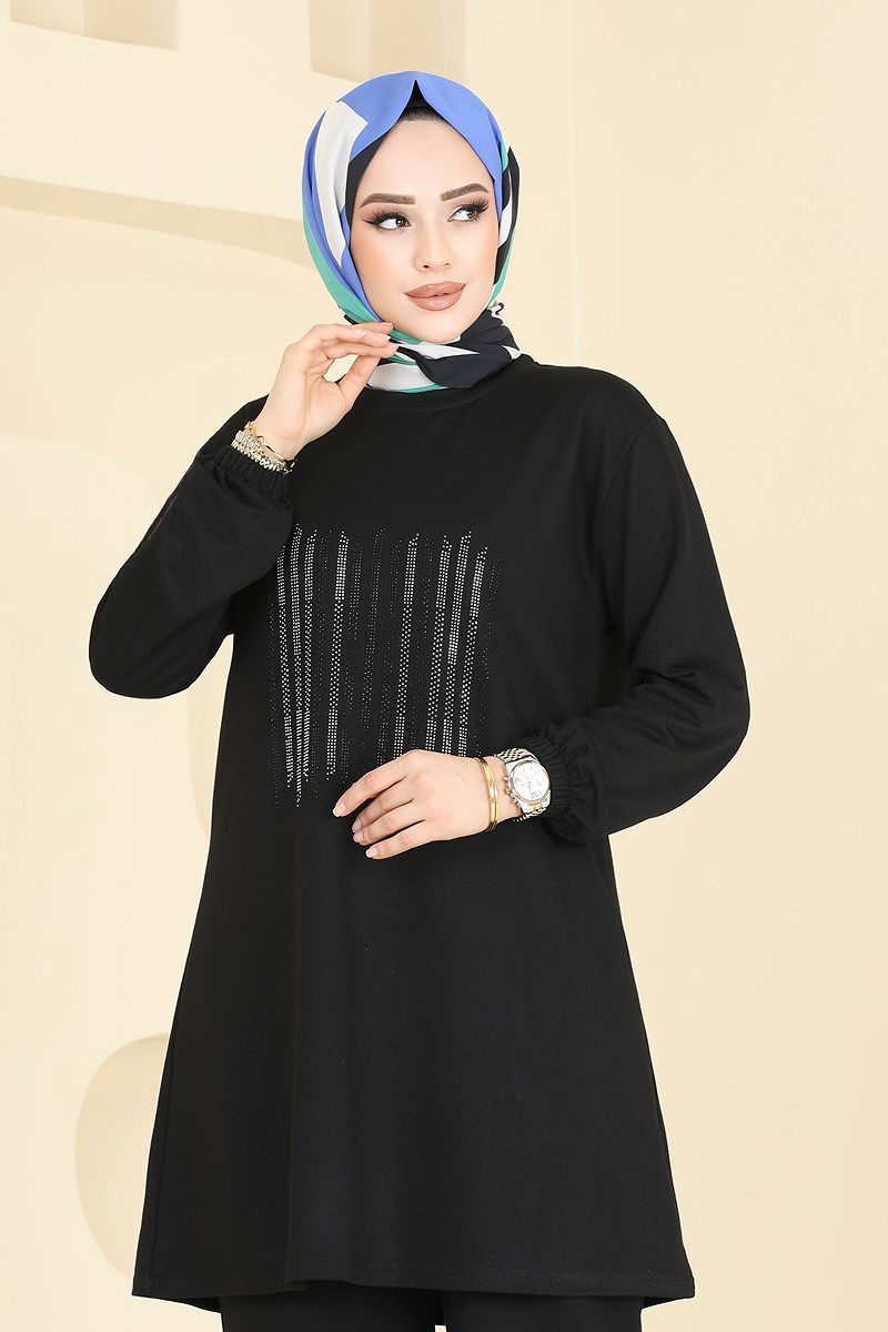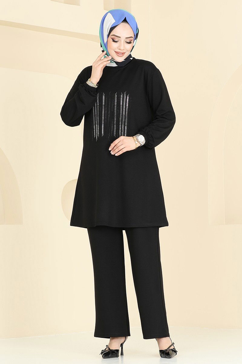 المنتج لديه ياقة دائرية. غير مبطنة. يتم لصق الحجارة. خصر البنطال مرن. السوار مطاطي. قد يكون هناك اختلاف في الدرجة اللونية في المنتج بسبب التقاط الصور الفوتوغرافية.