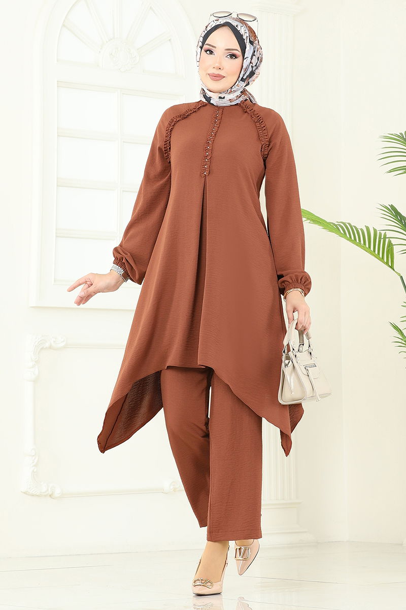 يوجد زر يمكن استخدامه من الخلف. المنتج لديه ياقة دائرية. غير مبطنة. يتم لصق الحجارة. خصر البنطال مرن. السوار مطاطي. قد يكون هناك اختلاف في الدرجة اللونية في المنتج بسبب التقاط الصور الفوتوغرافية.
