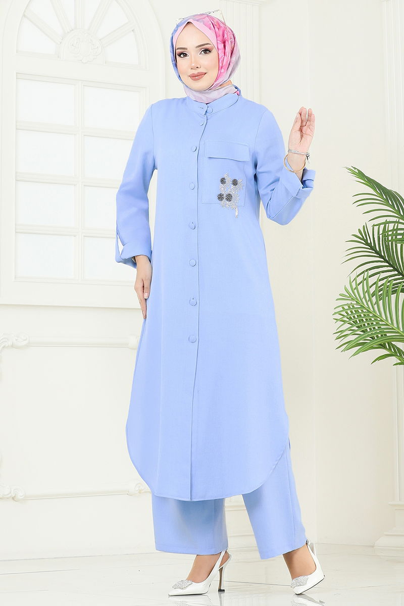 المنتج لديه ياقة نصف بيضوية. المنتج به أزرار من الأمام. البلوز تحتوي على فتحة. غير مبطنة. تفاصيل الخرز مخيطة. الجيب الصدري نشط. خصر البنطال مرن. أزرار الكفة نشطة. قد يكون هناك اختلاف في الدرجة اللونية في المنتج بسبب التقاط الصور الفوتوغرافية.
