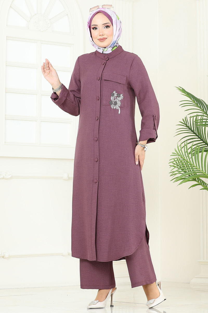 المنتج لديه ياقة نصف بيضوية. المنتج به أزرار من الأمام. البلوز تحتوي على فتحة. غير مبطنة. تفاصيل الخرز مخيطة. الجيب الصدري نشط. خصر البنطال مرن. أزرار الكفة نشطة. قد يكون هناك اختلاف في الدرجة اللونية في المنتج بسبب التقاط الصور الفوتوغرافية.