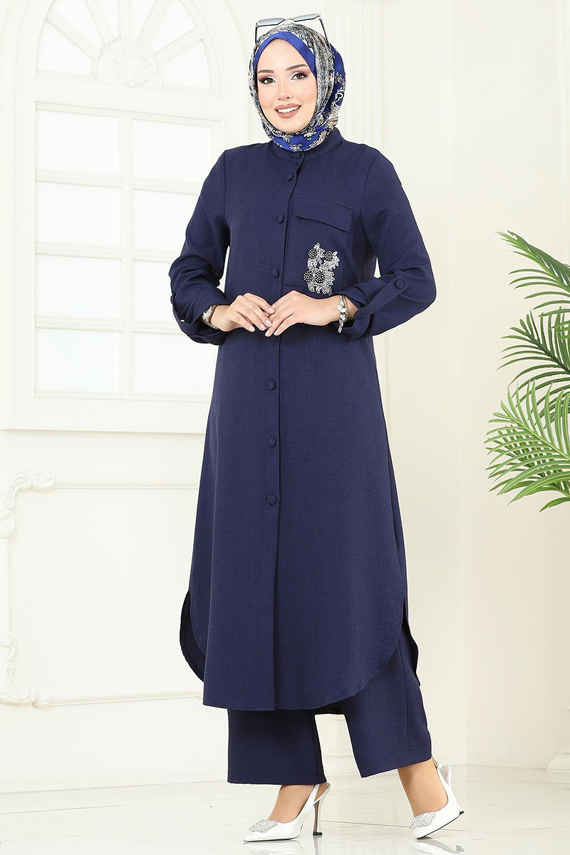 Product Feature : It is a new season hijab fashion product. The product has a Half Judge collar. The product has From the front buttons. The tunic has a side slash.. Unlined. Bead details are sewn. The chest pocket is active. The waist of the trousers is elastic. Cuff buttons are active. There may be a tonal difference in the product due to concept photo shoots.