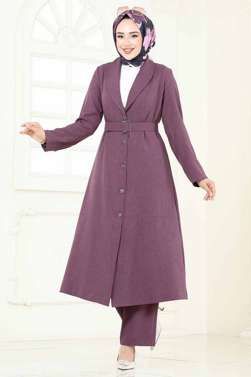 Product Feature : It is a new season hijab fashion product. The product has a Double-breasted collar. The product has From the front buttons. Unlined. Belt included, optional not available. The waist of the trousers is elastic. There may be a tonal difference in the product due to concept photo shoots.