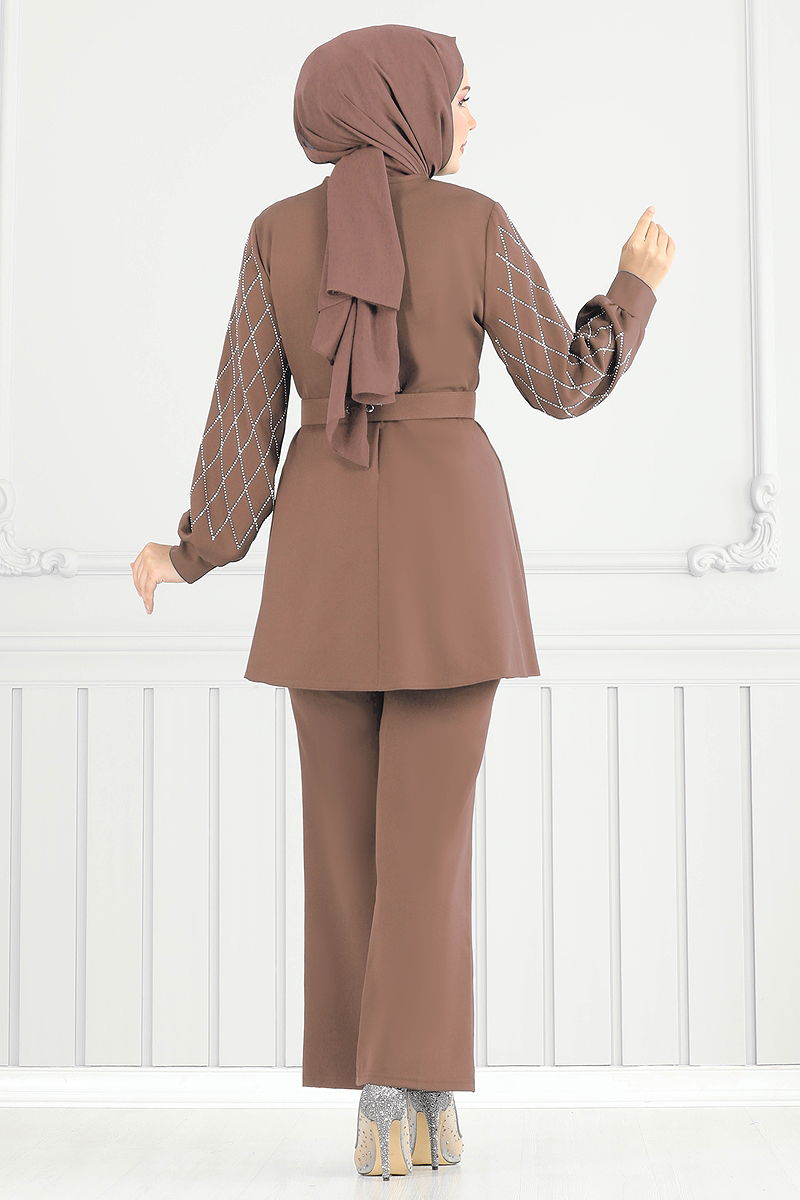 المنتج لديه ياقة دائرية. غير مبطنة. المنتج به سحاب في جزء من الخلف. يتم لصق الحجارة. المنتج يحتوي على حزام خصر مُخاط. الحزام متضمن، ،يمكن استخدامها حسب الرغبة خصر البنطال مرن. قد يكون هناك اختلاف في الدرجة اللونية في المنتج بسبب التقاط الصور الفوتوغرافية.