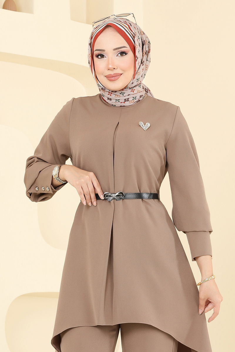 Product Feature : It is a new season hijab fashion product. The product has a Cycling collar. The product has from the back buttons. Unlined. Belt included, optional not available. The waist of the trousers is elastic. There may be a tonal difference in the product due to concept photo shoots.