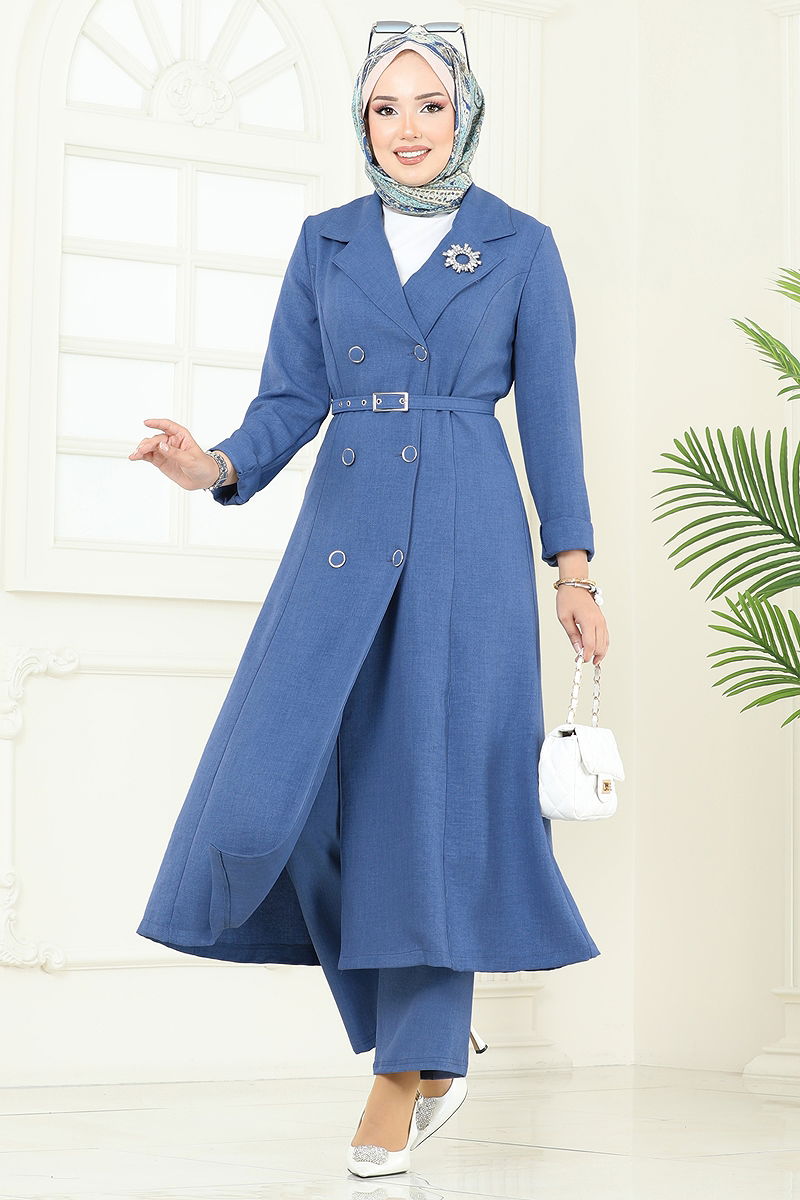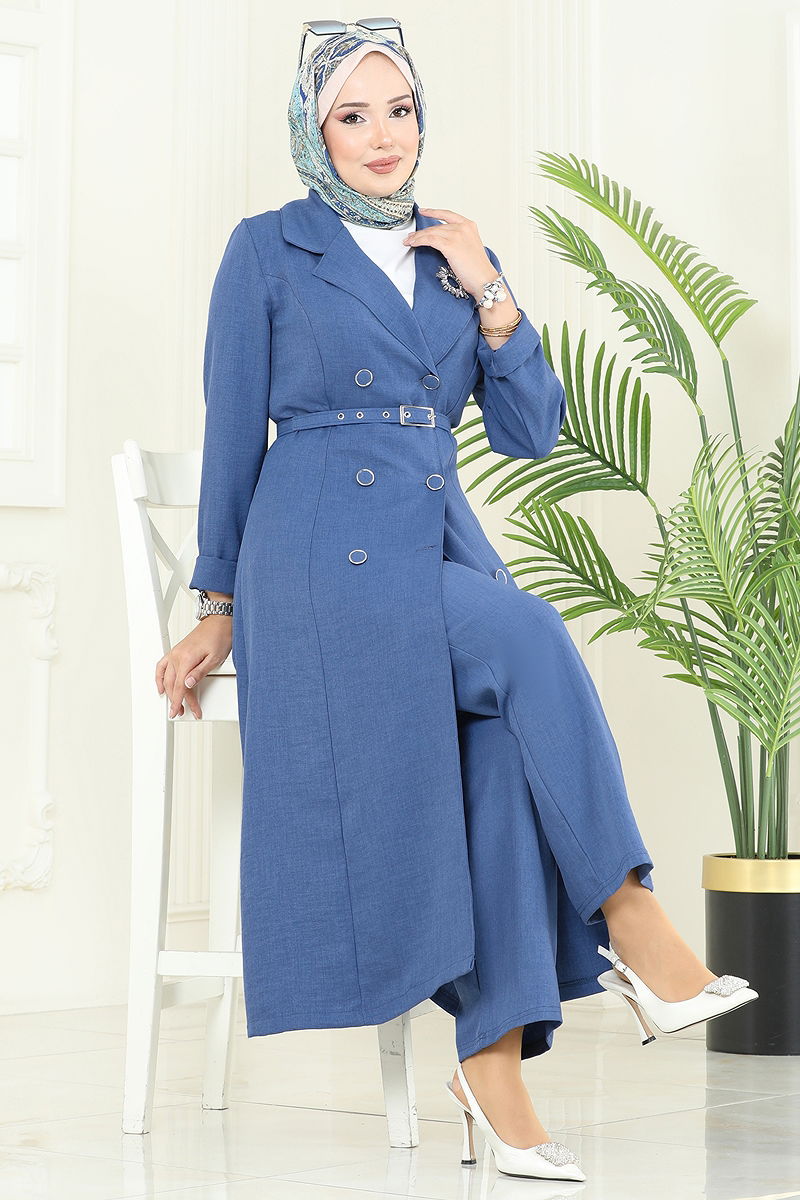 المنتج لديه ياقة مفتوحة. المنتج به أزرار نصف أمامي. غير مبطنة. الحزام متضمن، ،يمكن استخدامها حسب الرغبة خصر البنطال مرن. قد يكون هناك اختلاف في الدرجة اللونية في المنتج بسبب التقاط الصور الفوتوغرافية.