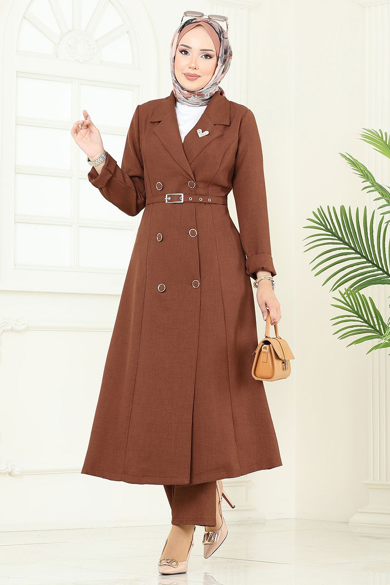 Product Feature : It is a new season hijab fashion product. The product has a Double-breasted collar. The product has half front buttons. Unlined. Belt included, optional not available. The waist of the trousers is elastic. There may be a tonal difference in the product due to concept photo shoots.