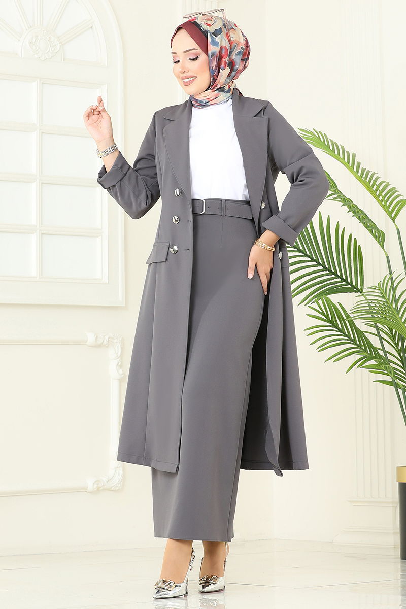 Product Feature : It is a new season hijab fashion product. The product has a Double-breasted collar. The product has half front buttons. Unlined. Belt included, optional not available. Pocket details are accessories. The skirt has a zipper at the waist. There may be a tonal difference in the product due to concept photo shoots.