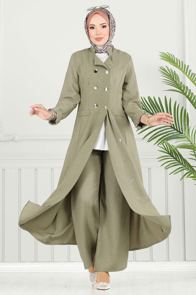يوجد نصف أزرار متوفرة من الأمام. المنتج لديه ياقة بيضوية. غير مبطنة. تفاصيل الجيب من الملحقات. خصر البنطال مرن. قد يكون هناك اختلاف في الدرجة اللونية في المنتج بسبب التقاط الصور الفوتوغرافية.