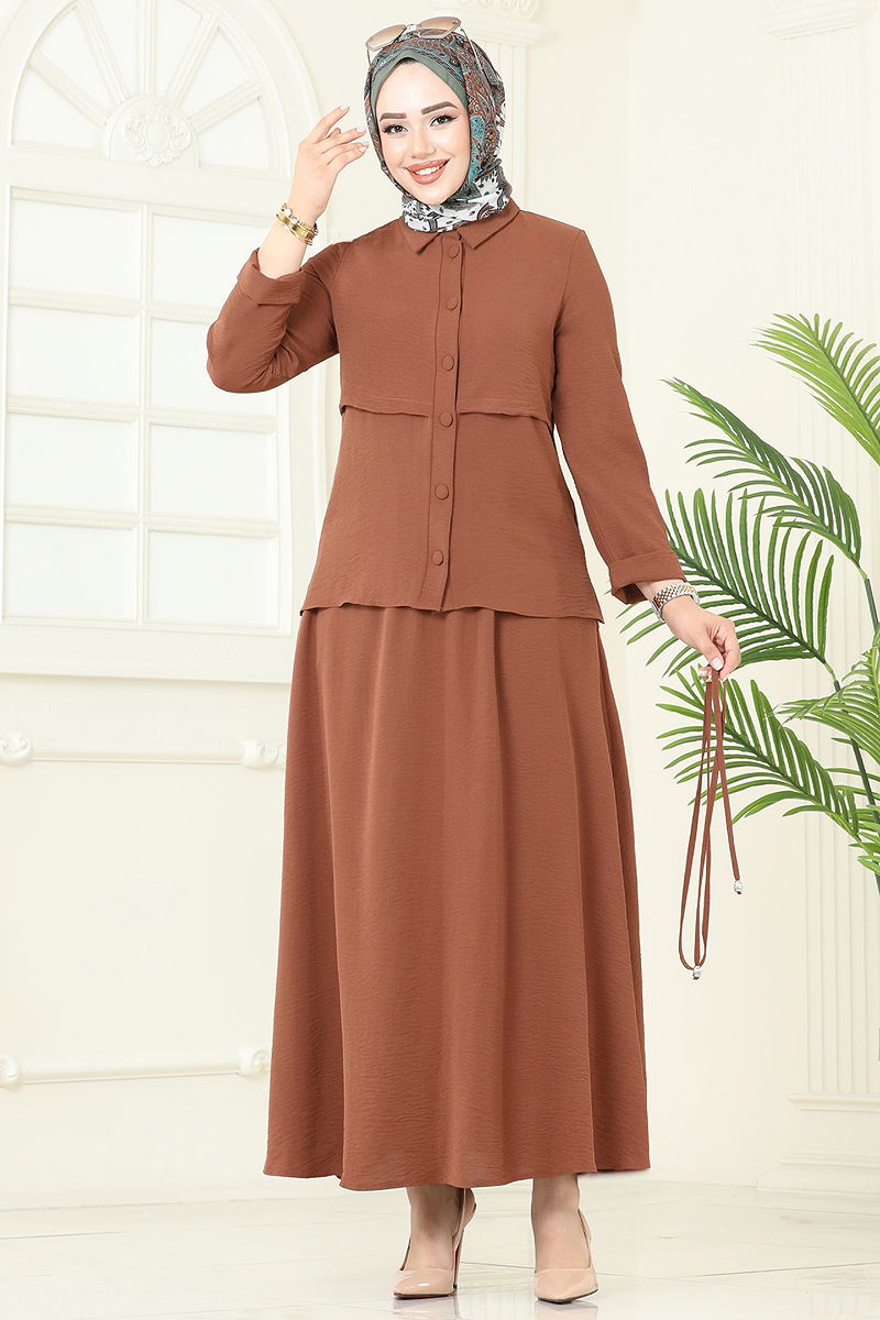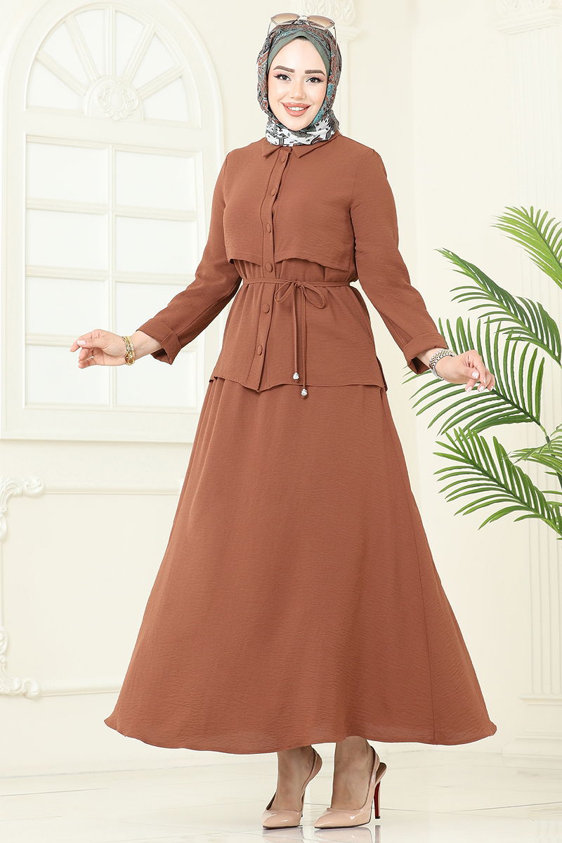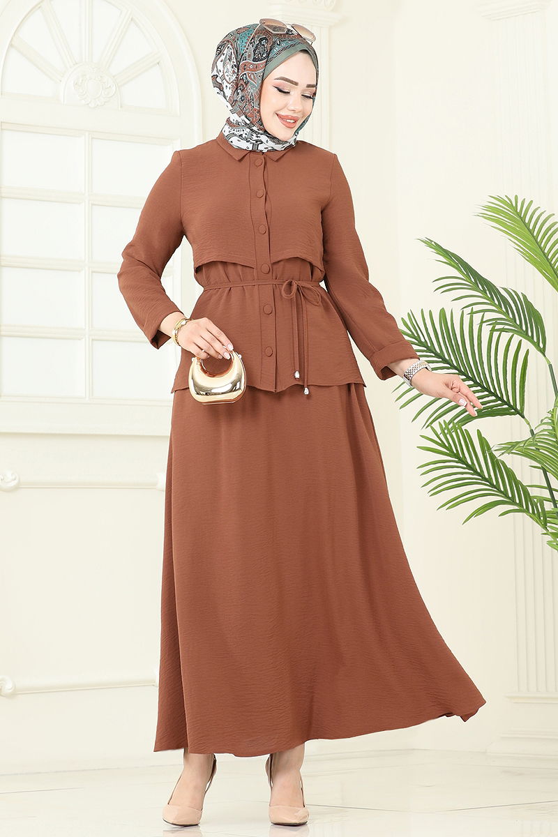 Product Feature : It is a new season hijab fashion product. The product has a Shirt collar. The product has From the front buttons. The tunic has a side slash.. Unlined. Belt included, optional not available. The product has a pocket. The skirt waist is elastic. There may be a tonal difference in the product due to concept photo shoots.