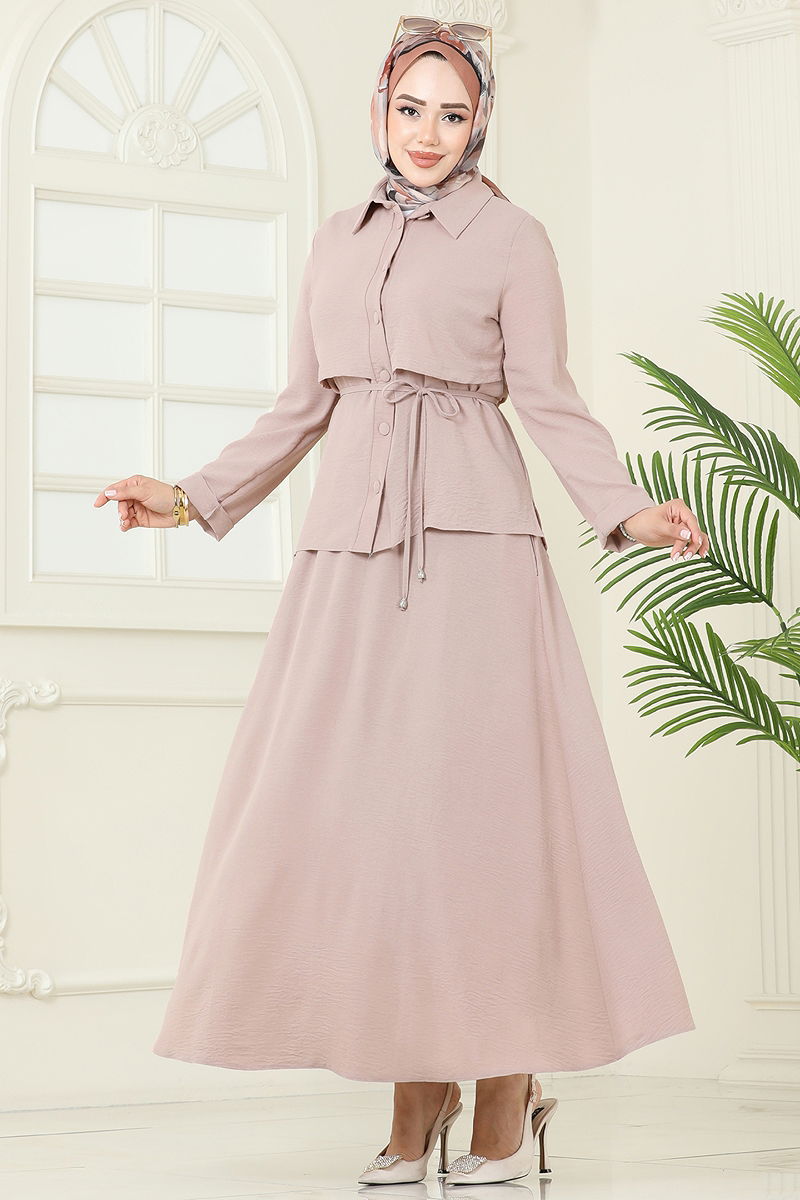 المنتج لديه ياقة القميص. المنتج به أزرار من الأمام. البلوز تحتوي على فتحة. غير مبطنة. الحزام متضمن، ،يمكن استخدامها حسب الرغبة يحتوي المنتج على جيب. .خصر التنورة مرن قد يكون هناك اختلاف في الدرجة اللونية في المنتج بسبب التقاط الصور الفوتوغرافية.