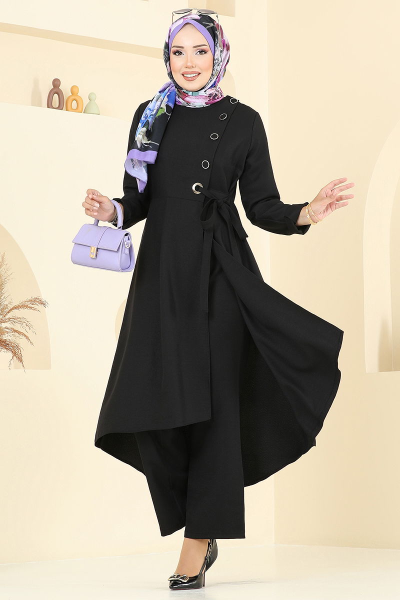 المنتج لديه ياقة دائرية. المنتج به أزرار نصف أمامي. غير مبطنة. يتم خياطة الحزام على المنتج. المنتج يحتوي على حزام خصر مُخاط. خصر البنطال مرن. قد يكون هناك اختلاف في الدرجة اللونية في المنتج بسبب التقاط الصور الفوتوغرافية.