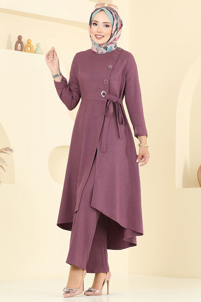 المنتج لديه ياقة دائرية. المنتج به أزرار نصف أمامي. غير مبطنة. يتم خياطة الحزام على المنتج. المنتج يحتوي على حزام خصر مُخاط. خصر البنطال مرن. قد يكون هناك اختلاف في الدرجة اللونية في المنتج بسبب التقاط الصور الفوتوغرافية.