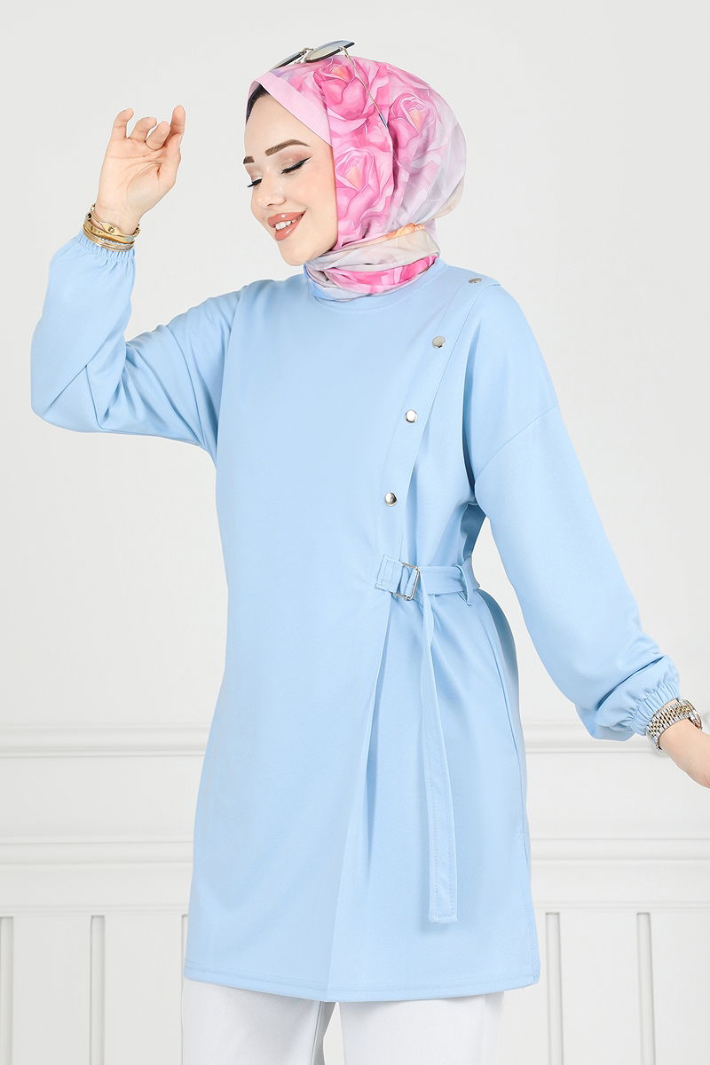 The Belted Lace-up Modest Suit is a fashionable outfit suitable for all seasons, made from scuba crepe fabric. It can be washed at 30 degrees on a delicate cycle. The set includes a tunic and pants, both featuring a tied, sewn-in belt and decorative buttons. The pants have an elastic waist, and the cuffs are also elastic. The tunic comes with a bicycle neck design and is unlined, providing a light and comfortable fit.