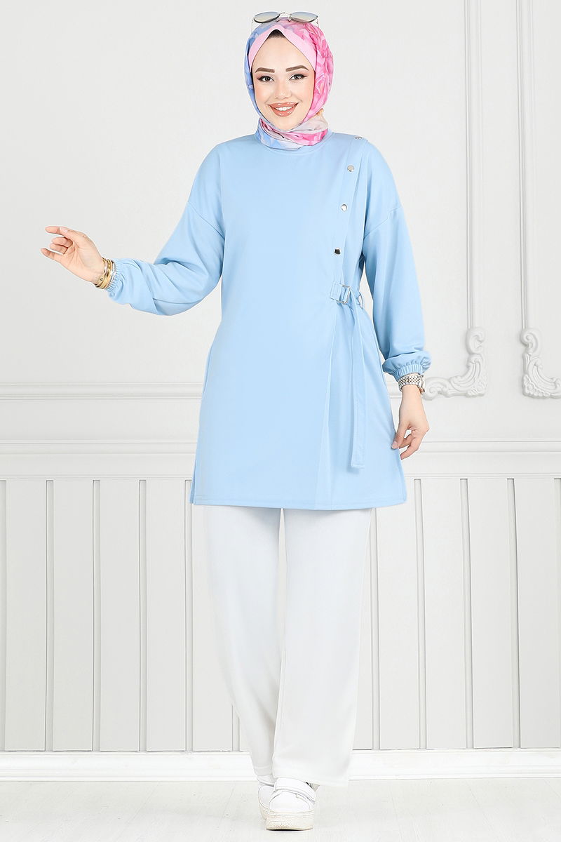 يحتوي على حزام يمكن تثبيته من الجانب. المنتج لديه ياقة دائرية. غير مبطنة. يتم خياطة الحزام على المنتج. الأزرار هي إكسسوارات. خصر البنطال مرن. السوار مطاطي. قد يكون هناك اختلاف في الدرجة اللونية في المنتج بسبب التقاط الصور الفوتوغرافية.